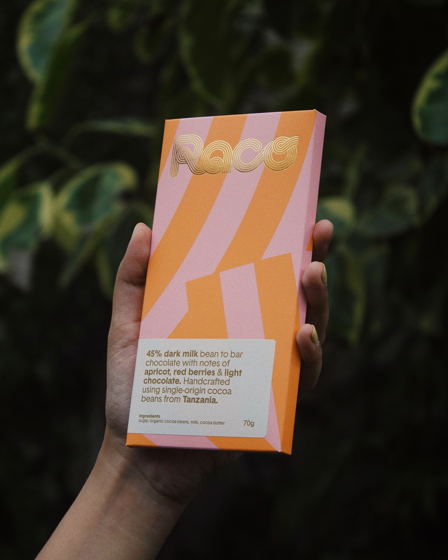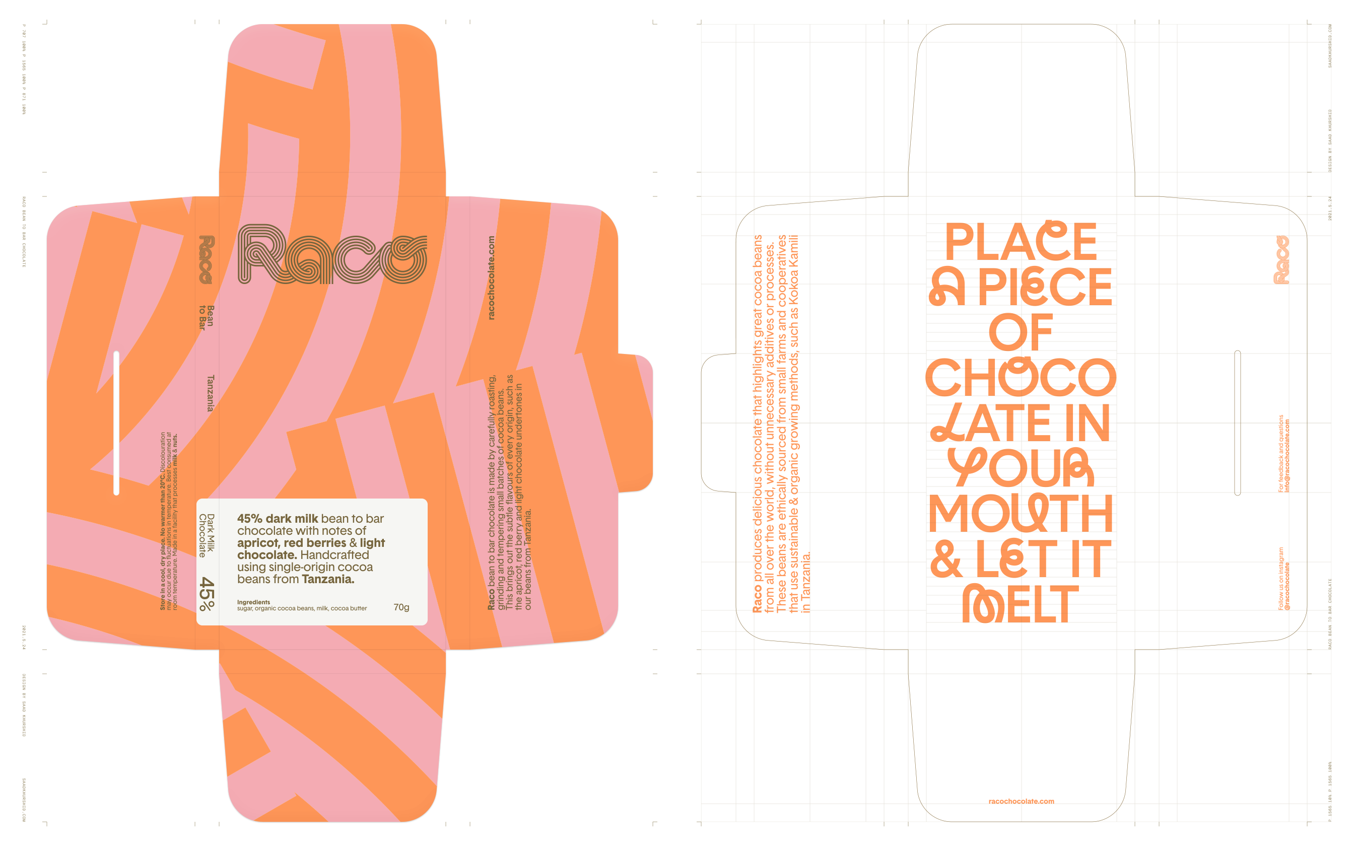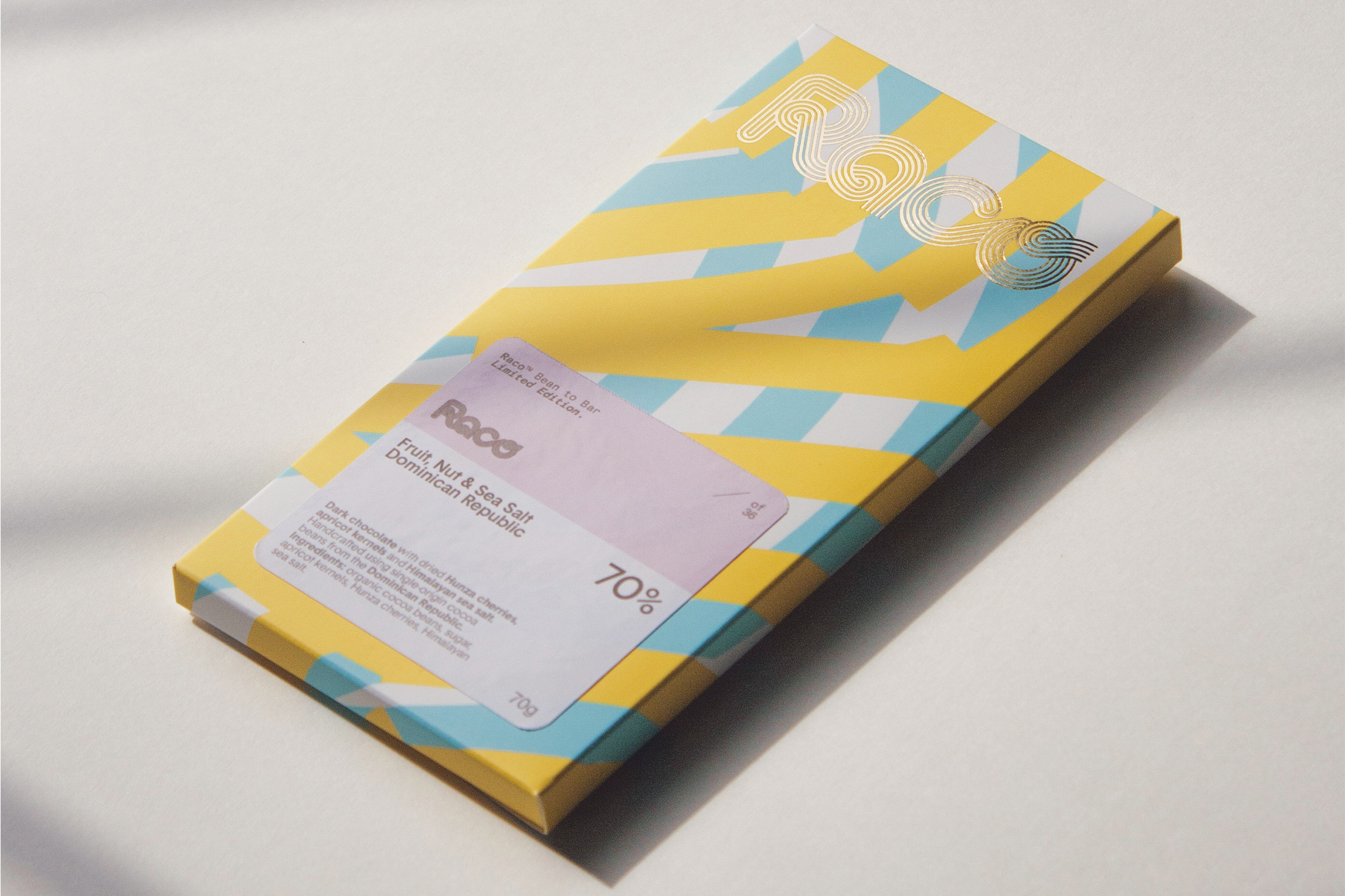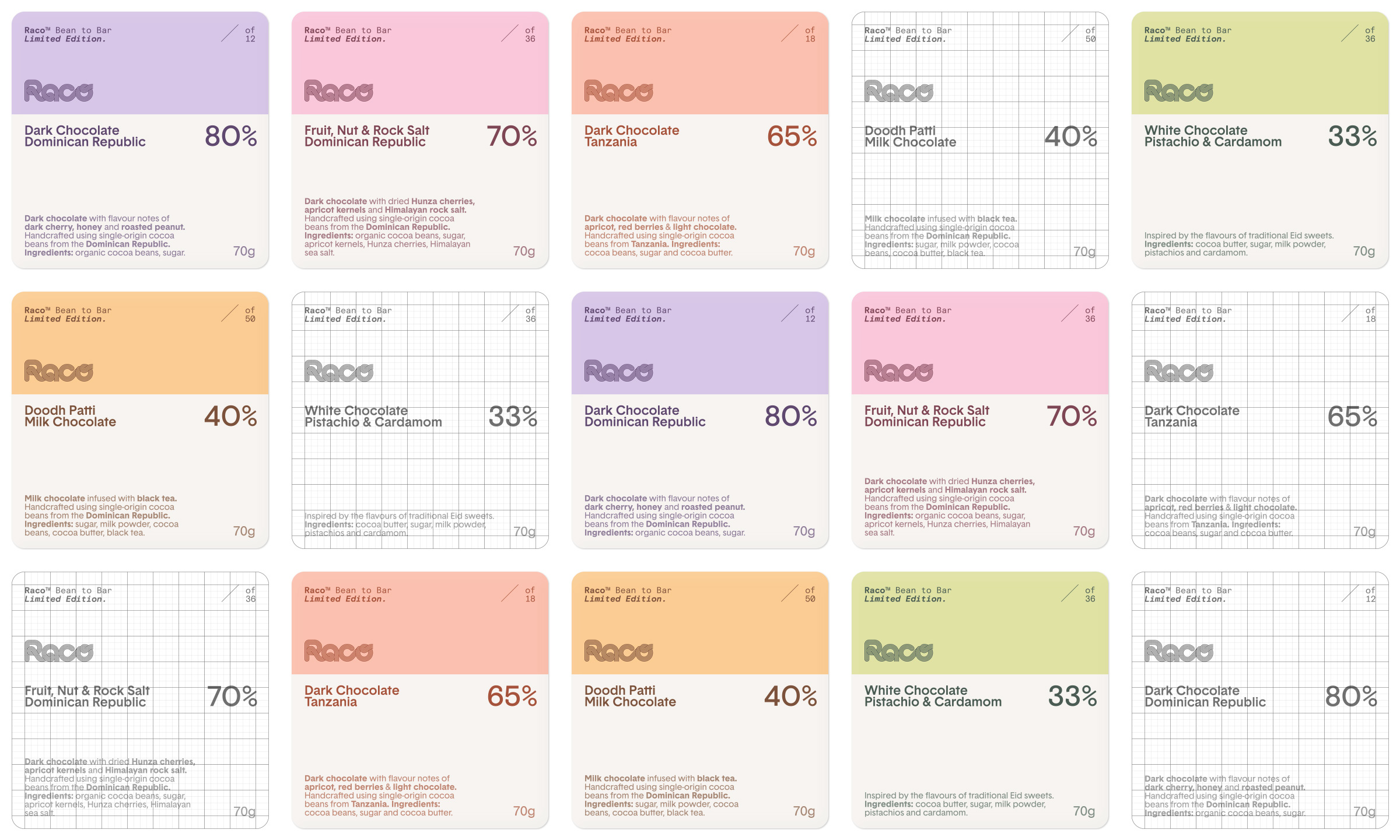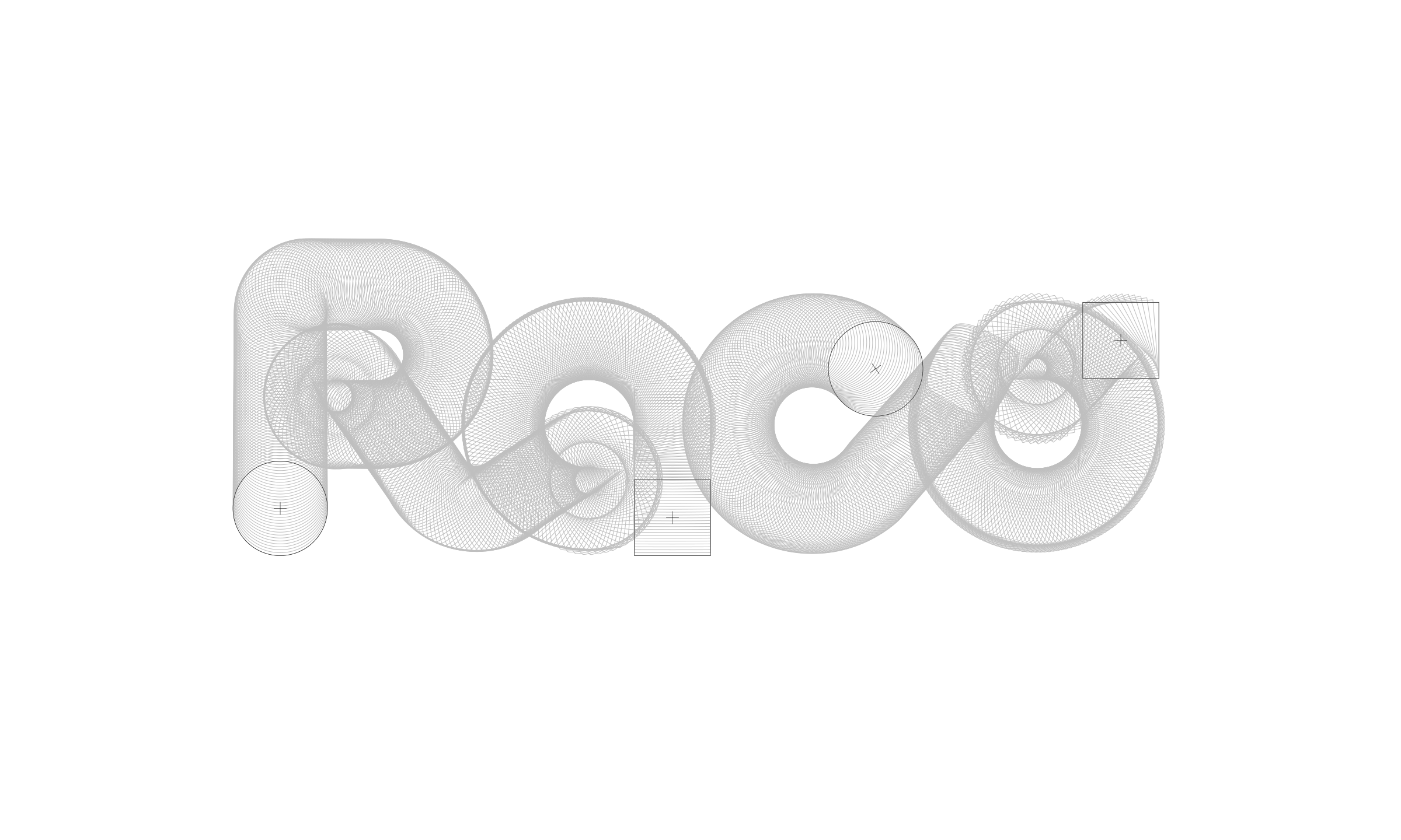 Logotype for a bean to bar chocolate company in Karachi. The logo consists of strokes that combine the syllables: ‘Ra’ and ‘Co’. The strokes start off with a round cap and end with a butt (square) cap. The transformation of the circle into the square symbolises the ‘bean to bar’ process of the chocolate. |