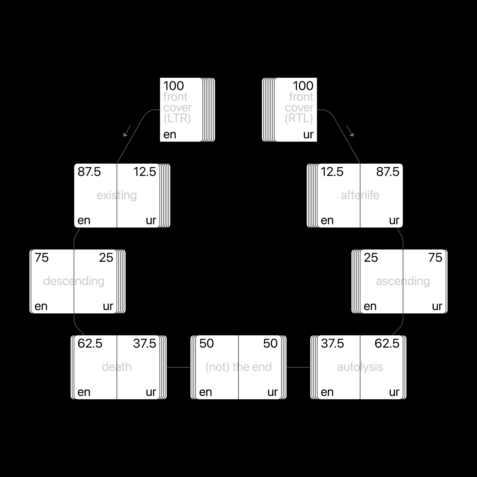 A conceptual book, depicting how a new culture can take over an existing one. The book makes use of the opposing reading directions of the two commonly spoken languages in Pakistan: English and Urdu, to create an experimental, palindrome-like reading format. It is common in Pakistan to combine both English and Urdu when speaking. Inspired by this amalgamation, the book transitions from one language to the other. When read from the 'left to right' direction, the book talks about the experience of death (in English), from an objective / scientific point of view, where death is the end of existing. From right to left, the book focuses on life after death (in Urdu), offering a more spiritual perspective, where death is not the end of existing. |